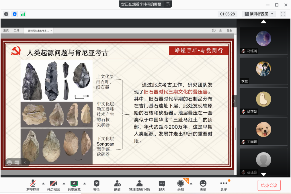 考古文博党小组结合中国考古学诞生及发展历程做了“峥嵘百年·与党同行”主题分享。杨慧介绍了新民主主义革命时期的中国考古学,指出“中国考古学的诞生与中国共产党的成立为同一年,为中国考古学事业的发展增添了重要意义。”宋浦文介绍了新中国成立至改革开放时期的中国考古学,从国民经济恢复发展的背景下审视中国考古学的发展。崔利鹏和刘奕璇分享了1978年至2012年间中国考古学的快速发展和转型以及中国博物馆事业再度蓬勃发展的相关内容。李玮涓分享了新时代以来的考古学发展,指出“建设中国特色、中国风格、中国气派的考古学”一直激励着考古学子,为我们更好认识源远流长、博大精深的中华文明注入了精神力量。