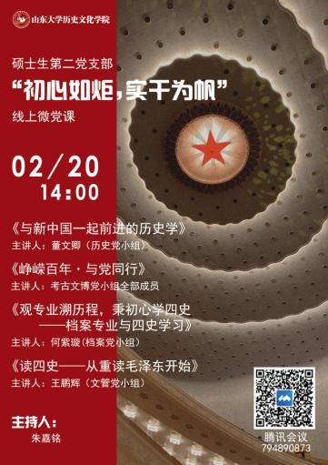为深入学习贯彻习近平总书记在党史学习教育动员大会上的重要讲话精神,迎接中国共产党百年华诞,充分发挥党支部战斗堡垒作用,历史文化学院硕士生党支部开展了“初心如炬,实干为帆”线上微党课活动。此次微党课由各专业党小组代表分别讲述了专业发展历程及先锋人物,将专业学习与“四史”学习相融合,引导广大青年员工知史爱党、知史爱国。硕士生第二党支部书记朱嘉铭主持活动,副处级辅导员李一楠和各年级员工党员、入党积极分子共同参与学习。