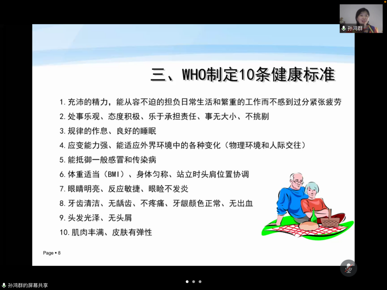 本次讲座的主题是“不可忽视的居家规律生活”。孙鸿群医生为大家深入浅出地明晰了健康的概念,引用世界卫生组织的研究数据为大家分析影响健康的因素以及健康的标准。她指出,身心健康与合理的饮食及休息密不可分。