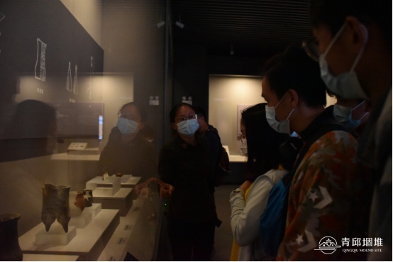 在菏泽市博物馆文物科科长任庆山的带领下,考古队队员走进菏泽市博物馆二楼的元代沉船出土文物展和博物馆馆藏文物展进行参观。在参观馆藏文物时,陈雪香结合目前堌堆发掘进度及遇到的问题进行讲解,为队员们的后续发掘及资料整理工作打好基础。