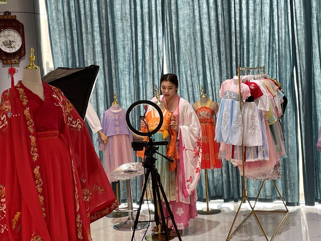 团队成员走访了位于曹县“E裳小镇”的汉服展销中心,参观了汉服生产流水线与汉服演出的线上直播,同时也对“电商兴村”的代表人物、“博士汉服工作室”的经营者进行了采访,了解了曹县汉服产业的诞生、转型与发展历程,以及电子商务如何推动曹县传统产业发展。