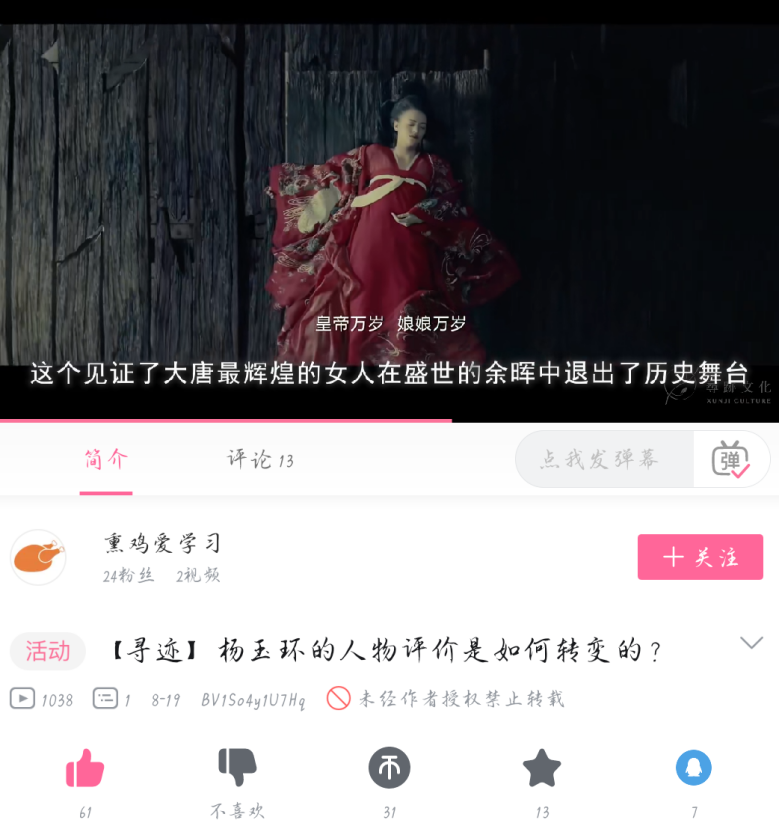 在第一期视频制作的磨合后,团队成员配合更加默契,各组分工协调有序。第二期视频的主题被最终确定为“杨玉环历史评价的转变”,从近年来与之相关的游戏、影视形象切入,分析对杨玉环古今评价的不同之处并探讨原因,在吸引青少年观看的同时引导他们了解历史、探索历史。为了让视频效果达到最好,文案编写完成后,策划、配音、剪辑等组同学在团队群组内多次讨论修改,素材、配音等也随之更新。经团队成员投票通过后,视频顺利在B站“熏鸡爱学习”账号发布,发布仅10天,已有1806次观看,收获73次点赞、39枚硬币、16次收藏及18条评论,获得了较好的效果,基本达到团队预期。