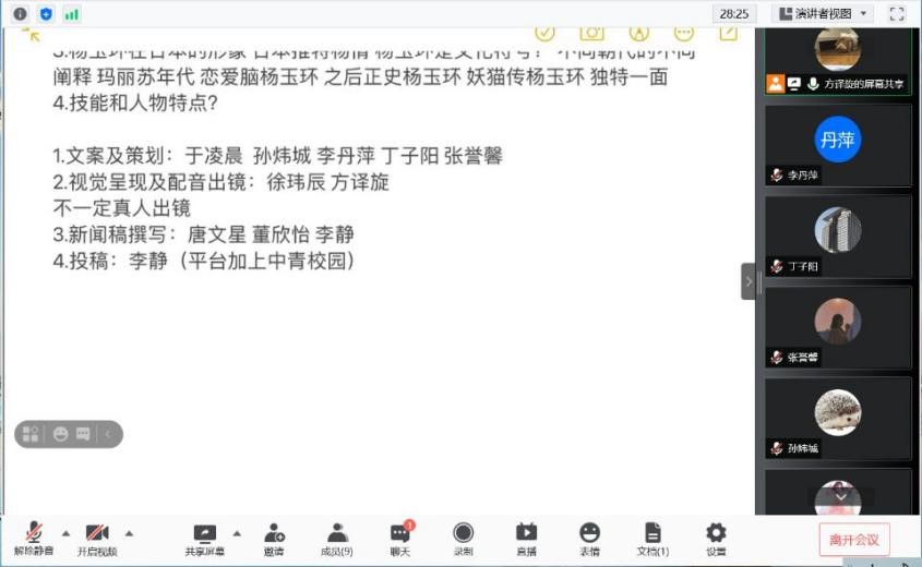 在完成了第一期视频的制作后,团队成员于8月3日晚开展了第二次会议讨论,在总结第一期视频制作经验的同时,就各分工小组间的配合及视频最终呈现效果进行了反思。例如针对上期视频存在的部分画面素材的缺失与配音表现力较弱等问题,团队将以真人出镜的方式弥补不足。同时,团队成员共同明确了新一期视频的主题、分工等内容,大家一起投入到了新一轮视频制作之中。