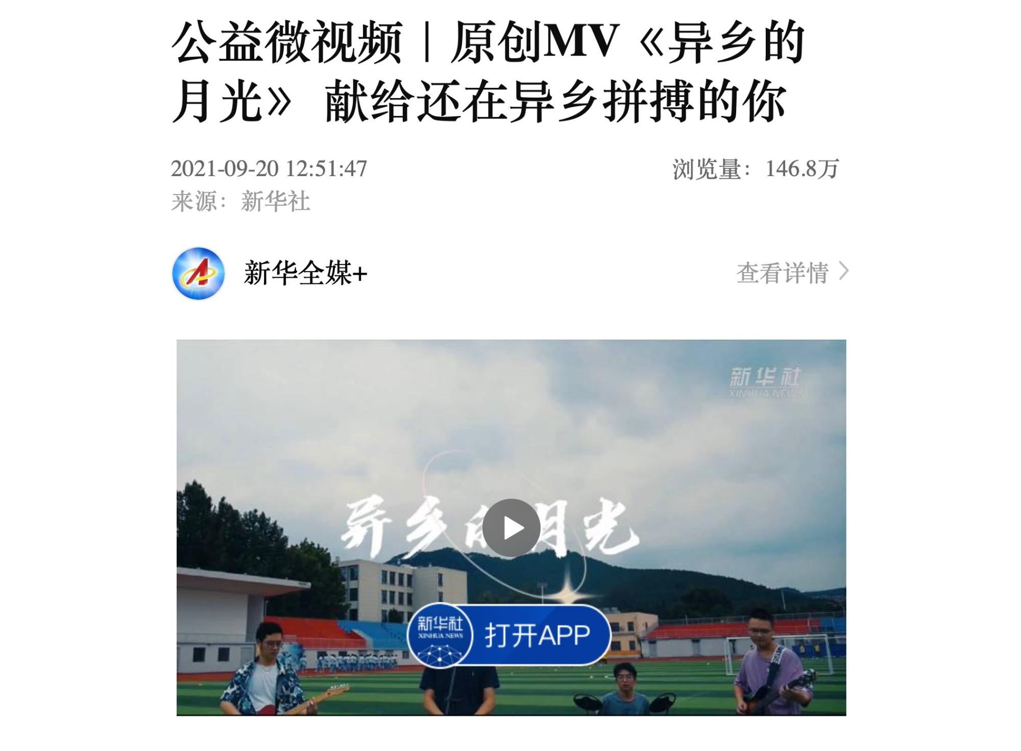 9月20日,新华社客户端刊发公司学子王鹏辉、耿嘉泽原创MV《异乡的月光》,这是公司学子首次独立创作完成并登上国内主流媒体的公益微视频作品,累计阅读量突破140万。