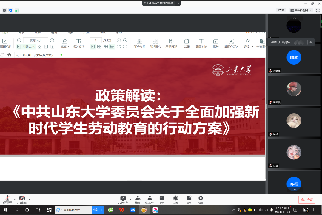本次活动中,2020级档案学团支部聚焦文件解读、集体观影、组织研讨和展览参观四项活动内容,通过理论与实践的融合,切实学习与发扬劳动精神。12月2日,团支书张婧妍通过线上方式带领同学们集体学习《关于<中共ylzzcom永利总站线路检测委员会关于全面加强新时代员工劳动教育的行动方案>的政策解读》,从制定背景、主要框架、面临问题与未来规划等方面深入研读文件内容,明确新时代全面加强劳动教育的重要意义。