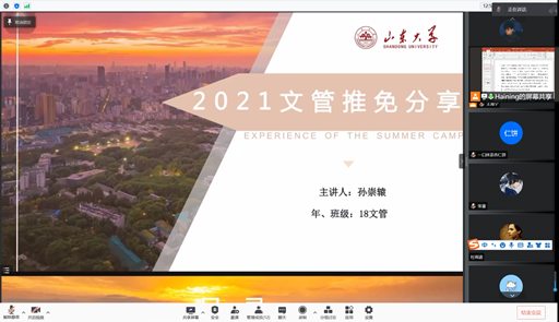 为帮助同学们更好了解考研保研现状,明确未来发展规划,2019级文化产业管理班级于12月4日和12月5日通过腾讯会议平台举行了线上经验分享交流会,孙崇辕学长、胡文清学姐、刘嘉威学长、丁佳宁学姐受邀分享,班长王海宁主持。
