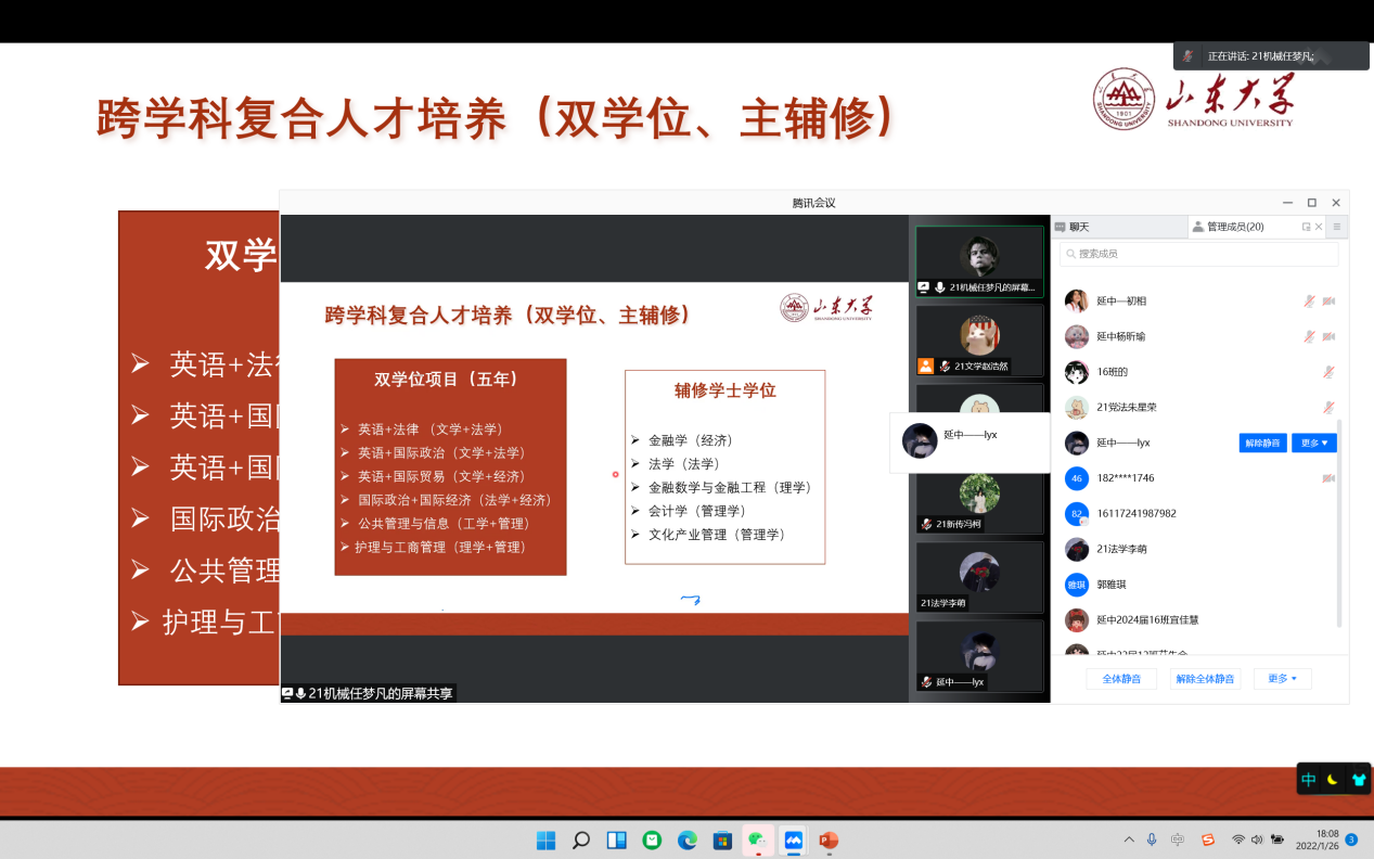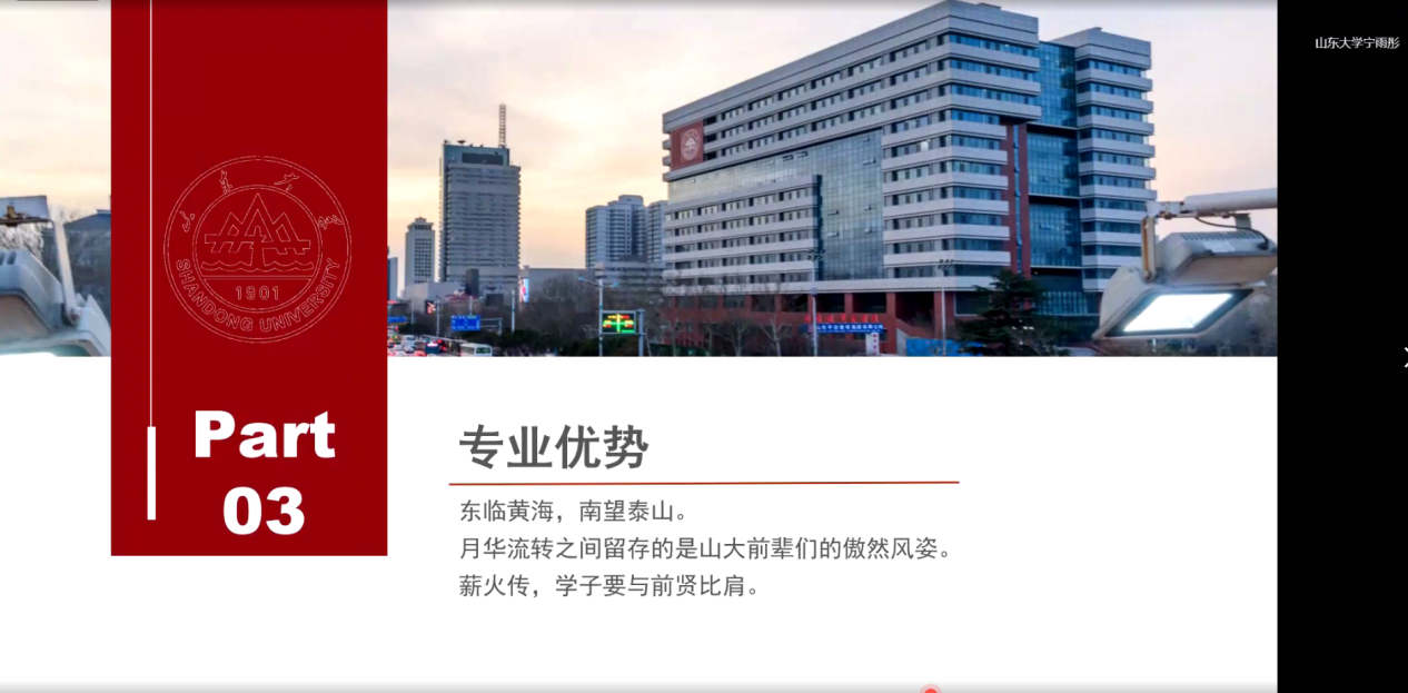 1月23日起,宣讲活动在各校陆续开展。考虑到陕西省疫情防控形势与要求,本次宣讲全程采用线上形式。为了做好活动预热,组员们提供了山大宣传视频在各中学进行播放,并利用腾讯会议等线上平台开展直播讲解。整体宣讲内容围绕“录取分数”“专业优势”“校园生活”三大模块展开,同时加入组员们的学习生活掠影与真实感受,符合高中员工现实需求,收到众多学子好评。