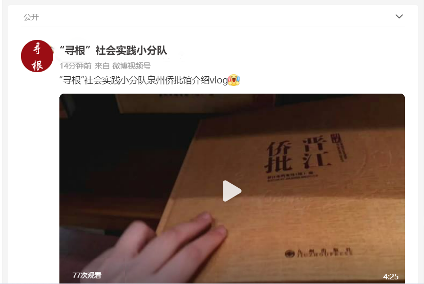 侨批作为一种具有超越国界价值的文献资料,给当代人留下关于海外华人艰苦创业、开拓拼搏、热爱家乡、惦念亲人的历史记忆,也为历史与现代架起一座文化的桥梁,是名副其实的世界记忆遗产。为了让更多的人了解侨批文化,团队成员在调研时用VLOG记录下泉州侨批馆调研全过程,并上传至主流媒体平台,借助新媒体的传播作用,进一步弘扬可歌可泣的侨批精神。