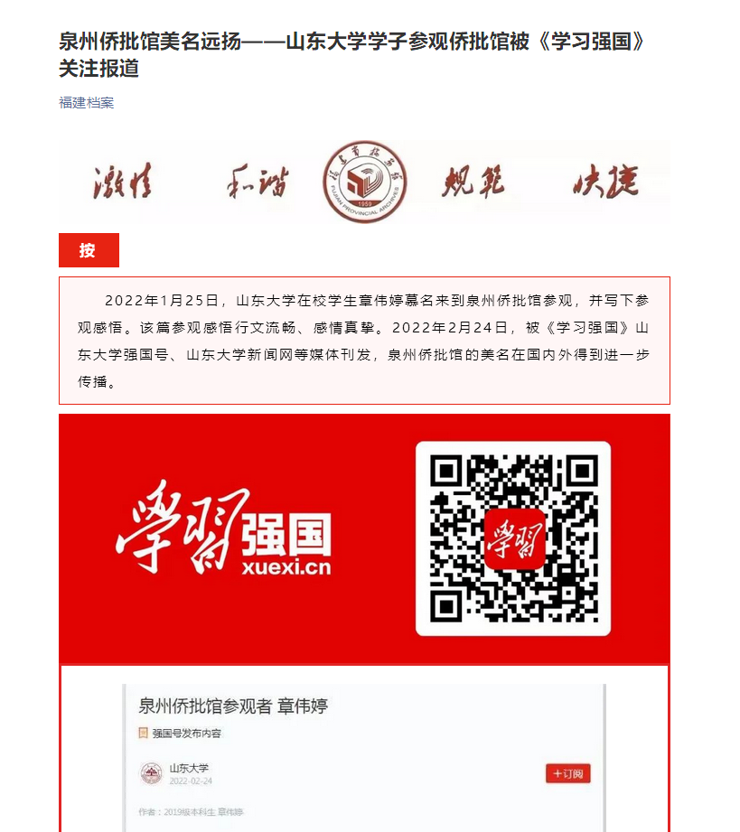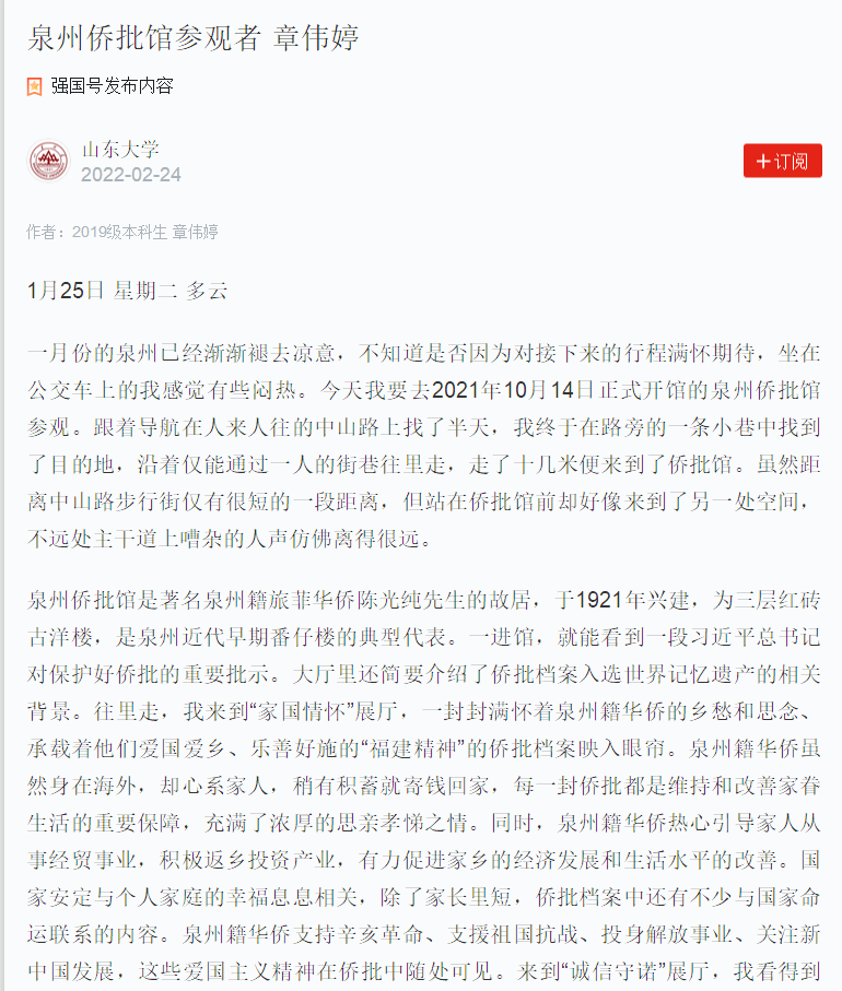 2月24日,“学习强国”ylzzcom永利总站线路检测强国号刊发2019级档案系本科生章伟婷的文章。3月9日,福建省档案馆官方微信公众号“福建档案”发表了名为“泉州侨批馆美名远扬——ylzzcom永利总站线路检测学子参观侨批馆被《学习强国》关注报道”的文章,对章伟婷的文章内容给予高度评价。