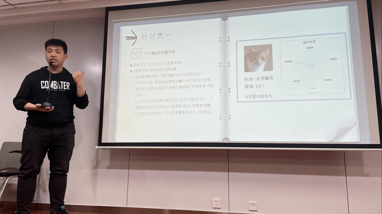 现保研至武汉大学的谢鹏鑫学长首先进行分享。他首先向大家介绍了保研的基本流程及参加夏令营需要满足的基本条件和要求,并结合自身保研经历向大家分享了许多宝贵的经验,包括院校选择、面试准备工作、面试注意事项等。此外学长鼓励大一学弟学妹们好好学习,努力提高成绩,同时也要注意保持规律作息。