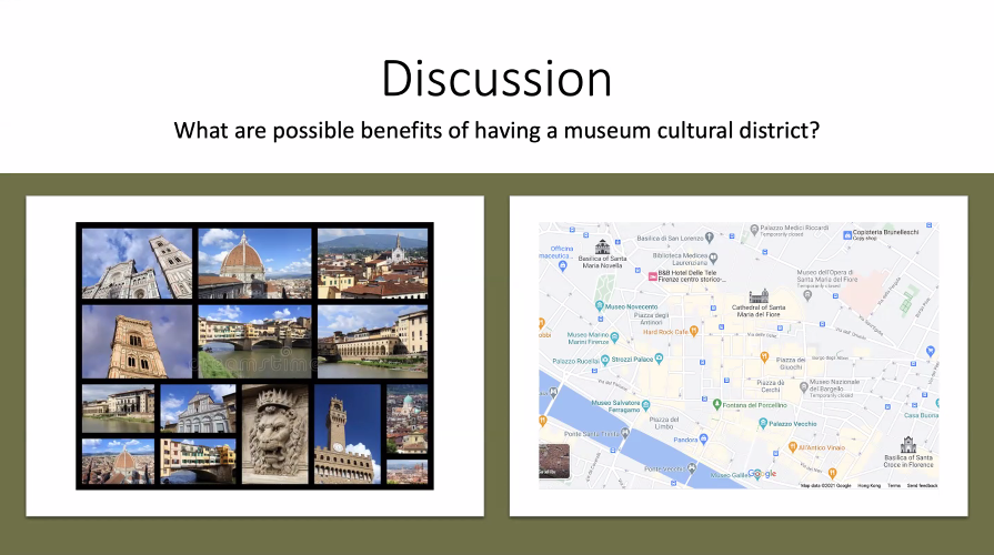 《文化场馆与文化区管理》课程旨在使员工对文化场馆及文化区有基本理解,并鼓励员工参观和深入了解各类文化场馆、各类文化活动。课程分为四个部分,包括文化场馆及文化区的概念、价值、管理及节目策划,同时老师也在课堂中阐释了有关文化场馆的学术观点,展示和讲解了很多文化场馆的特色及其文化活动。课程按照每两节课一个板块,每个板块结束时提供10-15分钟的自由讨论时间,如在文化场馆及文化区的概念这一部分的讨论围绕着设立博物馆型文化区可能会带来的益处进行。