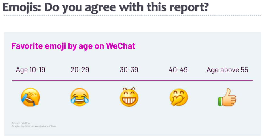 全英文授课和Zoom线上教学对同学们具有一定挑战性,但任课教师深厚的学术理论功底、细致严谨的课堂讲授,以及和蔼可亲的教学态度,激发了大家的学习热情。课堂上同学们与老师积极互动,通过聊天区积极回答老师提出的问题,踊跃表达自身观点。Roselyn Lee-Won副教授在讲解概念时也会结合中国社交媒体案例帮助同学们更好地理解课程内容,例如,在讲解social affordances的时老师选择了“微信不同年龄阶段的人最喜欢的表情”和同学们进行互动,即迅速引起大家热烈讨论。