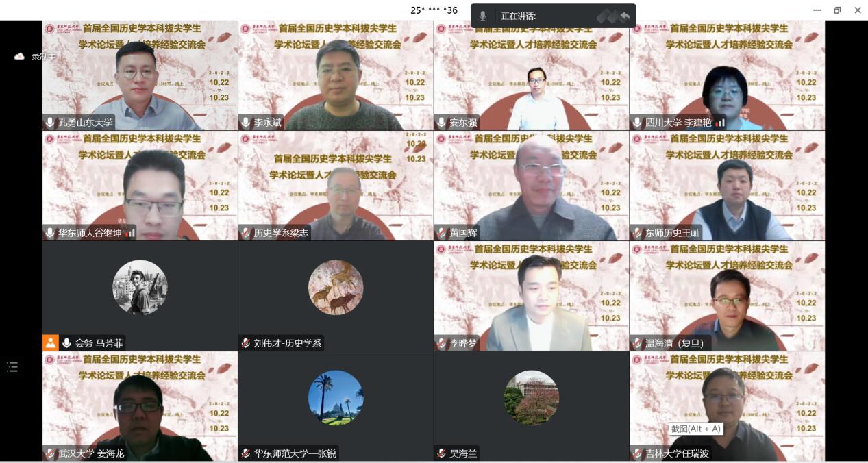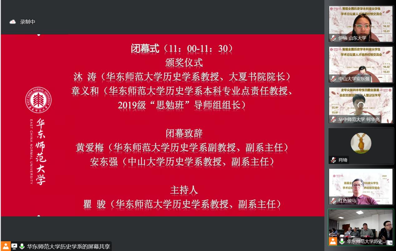 为推动拔尖计划2.0基地建设,加强兄弟院系间相互交流与学习,促进历史学本科拔尖人才成长发展,2022年10月22日至23日,华东师范大学主办首届“全国历史学本科拔尖员工学术论坛暨人才培养经验交流会”。历史文化学院孔勇老师与2019级本科生伊楠、2020级本科生王若蘅线上参会。