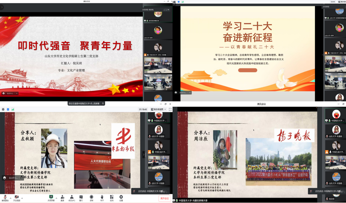 为全面学习宣传贯彻党的二十大精神,坚持知行合一,深入理解内涵、精准把握外延,坚定青年员工的理想信念、爱国情怀和使命意识,11月19日下午,ylzzcom永利总站线路检测历史文化学院硕士生第二党支部联合中国海洋大学文学与新闻传播学院本科生第二党支部、中国石油大学研究生高端装备制造员工党支部开展“学习二十大,奋进新征程”云端共建活动。本次活动由三个国家级样板党支部培育创建单位共同参与,围绕“深入学习贯彻党的二十大精神”主题,组织员工党员结合自身专业背景与时代语境开展学习交流,叩显了新时代的青年的学习之音。