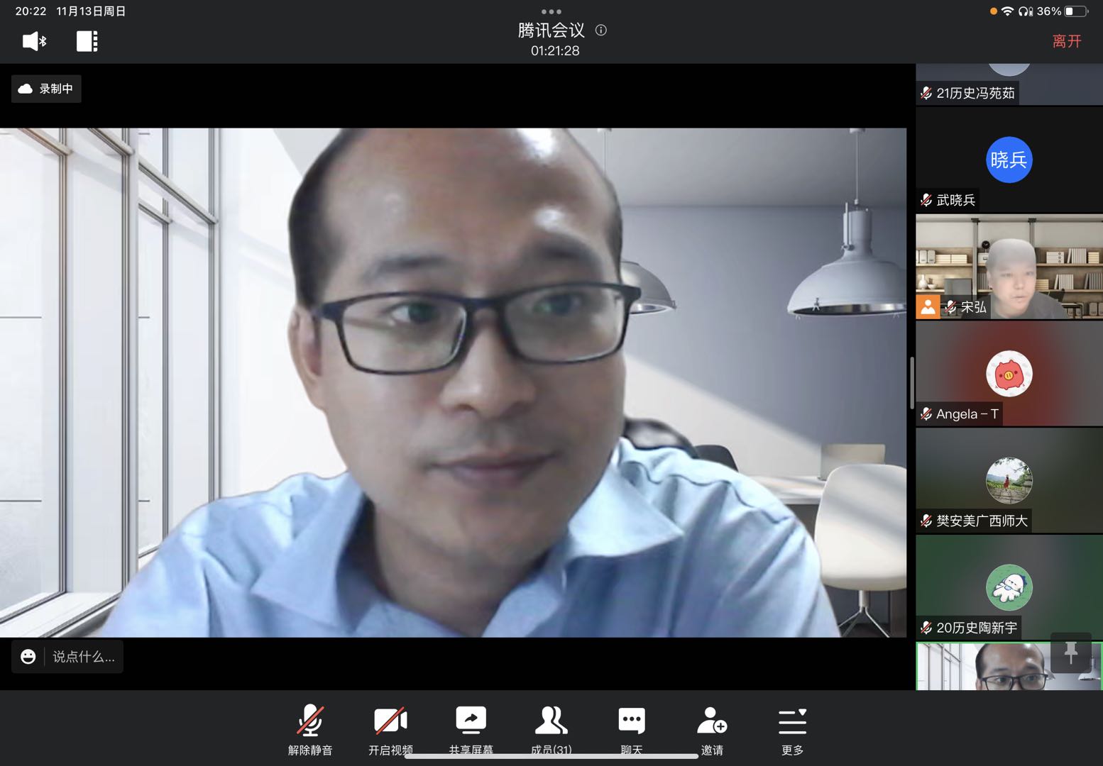 讲座最后,王旭东老师与线上的老师和同学们就如何在浮躁的环境中潜心治学进行了深入的交流。2021级历史班班主任宋弘就讲座内容做了总结,并再次表达对王旭东老师及与会师生的欢迎与感谢。