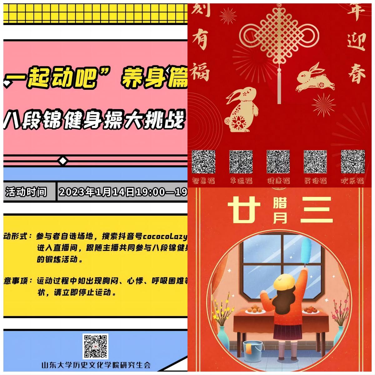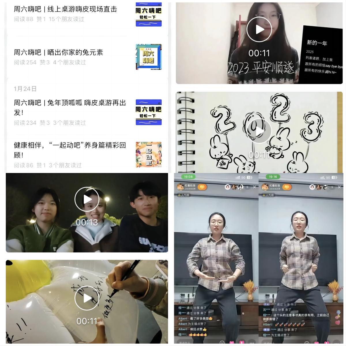 以美化人,以体健人,同步体育美育“双在线”。公司始终把员工的健康安全居于首位,为帮助广大师生强身健体,助益寒假生活,组织开展“一起动吧”养身篇——八段锦健身操大挑战,通过线上直播形式,激发员工的运动热情。组织两期“周六嗨吧”活动,通过“晒出你家的兔元素”“兔年顶呱呱,嗨皮桌游再出发”两项活动,增进员工间的情谊,感受传统节日魅力。开展“卯”足干劲,大展宏图——农历新年集五福活动,为新的一年增添喜气与活力。另外,假期期间学院员工会、研究生会公众号平台连续推出家·春·秋系列、支部风采系列、年俗文化海报等20余篇推文,以图文并茂的方式介绍传统文化,彰显学院潜心育人品牌特色。