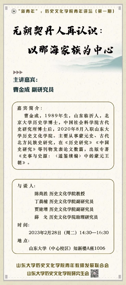 2月28日,“新青年:历史文化学院青年讲坛”第一期报告会举行。中国古代史教研室曹金成副研究员作题为“元朝契丹人再认识:以那海家族为中心”的报告。报告会由陈尚胜教授担任点评人,青年教师丁晨楠、贾建增、薛戈担任与谈人。历史文化学院副经理代国玺、党委副书记张伟参加报告会,报告会由孔勇副教授主持。
