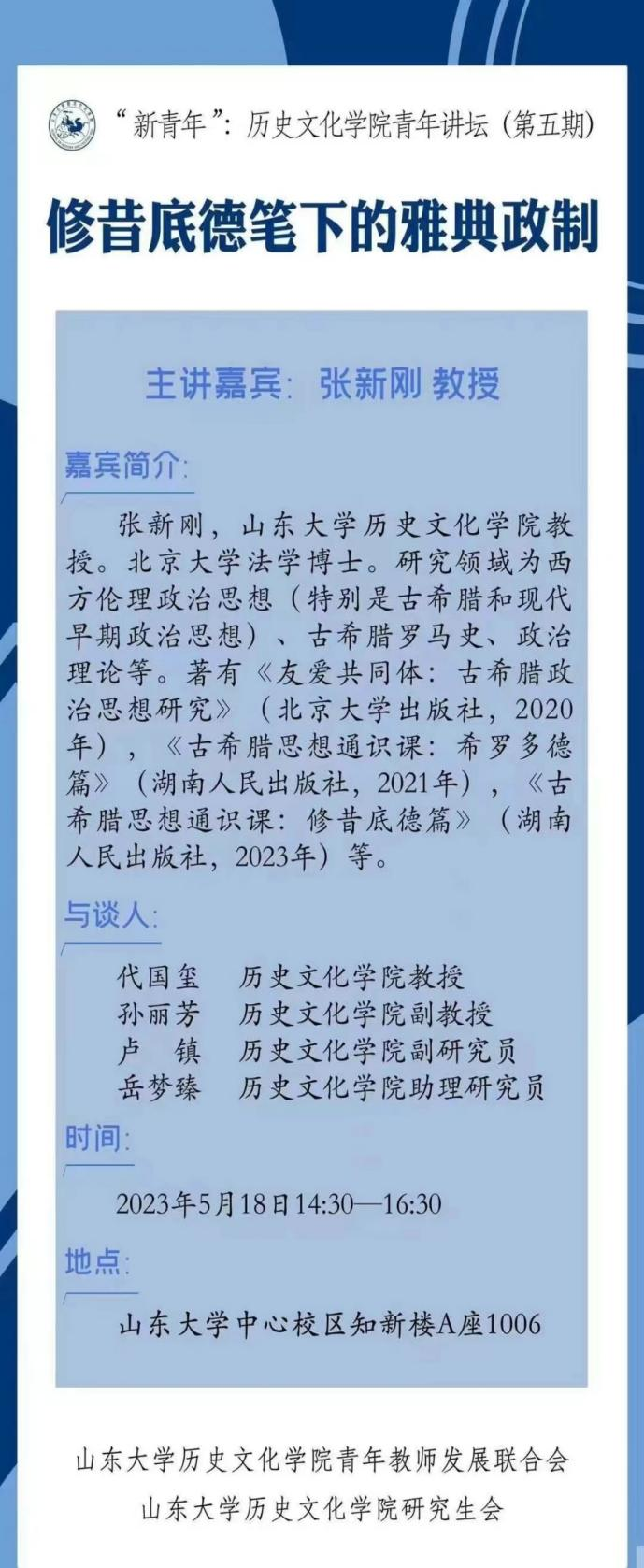 5月18日下午,“新青年:历史文化学院青年讲坛”第五期报告会举行。本次报告会的主题为“修昔底德笔下的雅典政制”,由世界史学系张新刚教授主讲,代国玺副经理以及孙丽芳、卢镇、岳梦臻、彭博等青年教师到场与谈。